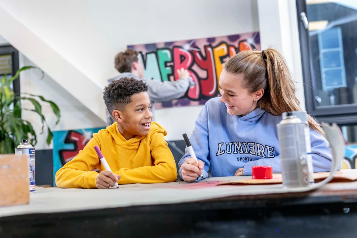 Britt is docent CKV en begeleidt de groep met veel passie. “Ik moet sommige leerlingen soms om half 6 de deur uit trappen, zó leuk vinden ze het. Je ziet kleine kunstenaars in de dop; hier krijgen zij de ruimte, motivatie en tijd om die talenten te ontwikkelen.”